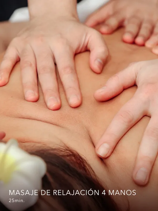 Dos terapeutas trabajan simultáneamente en sincronía con movimientos suaves, envolventes y armoniosos que junto al uso de esencias y aceites naturales ayudan a liberar el estrés acumulado por la rutina diaria. Disponible en sesiones de 25 minutos, el Masaje a 4 Manos multiplica la sensación de bienestar y permite al cuerpo alcanzar un nivel profundo de desconexión.