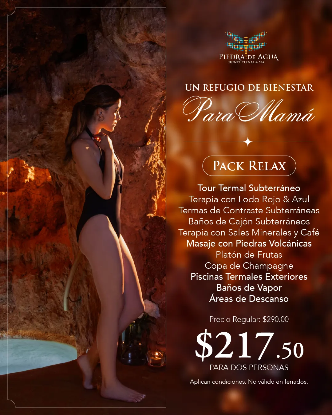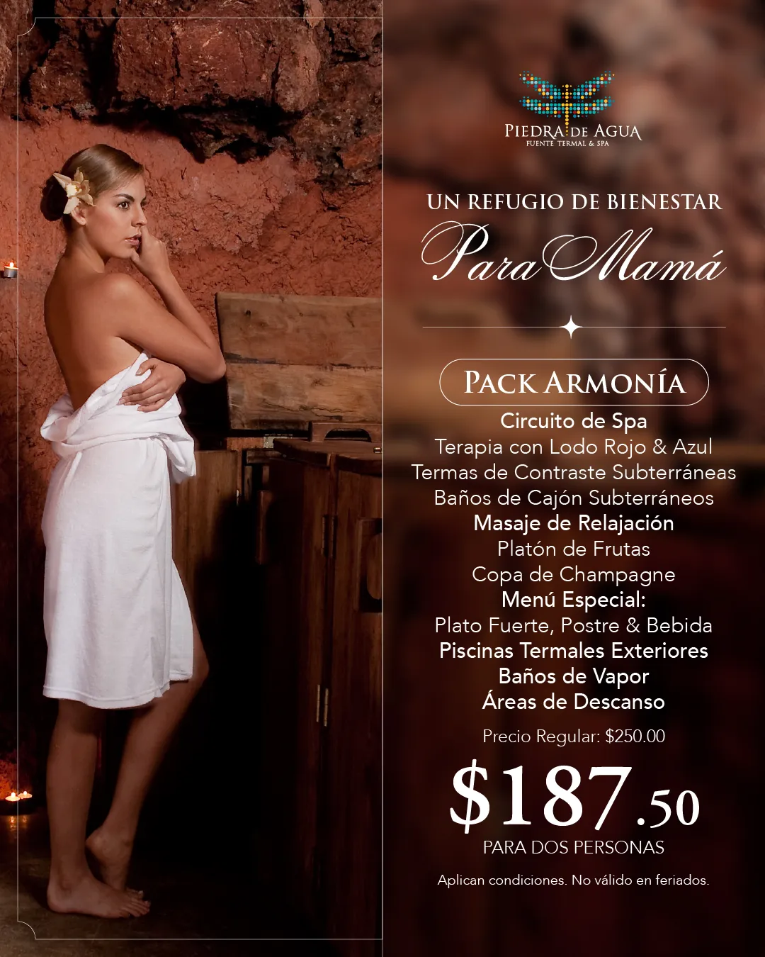 - La promoción de “Un refugio de bienestar para Mamá” aplica para compras online a través de www.piedradeagua.com.ec y directas en nuestro local.